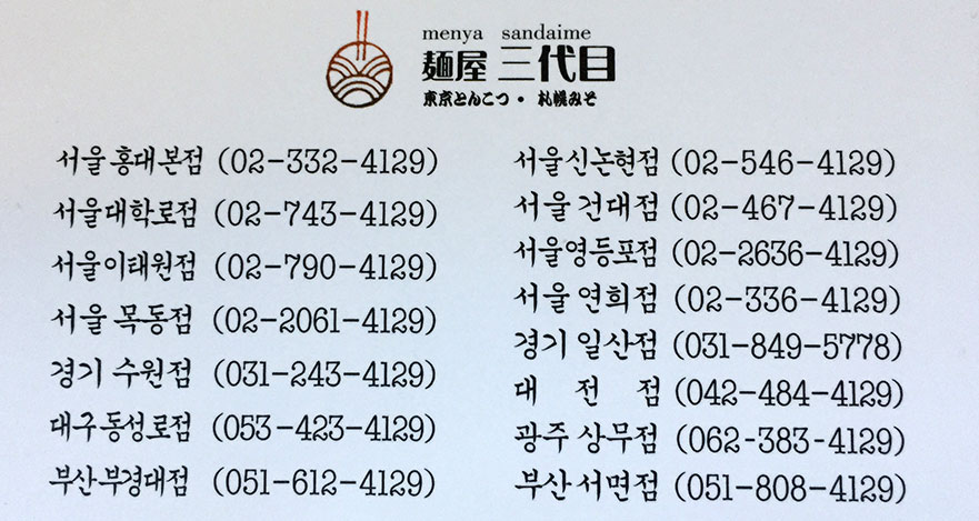 Here’s a card they gave me with phone numbers to other locations around Korea. Looks like they haven’t added all of their Busan restaurants here either, but the bottom “051” numbers are for the one in KSU/Pukyong area and the other for Seomyeon.