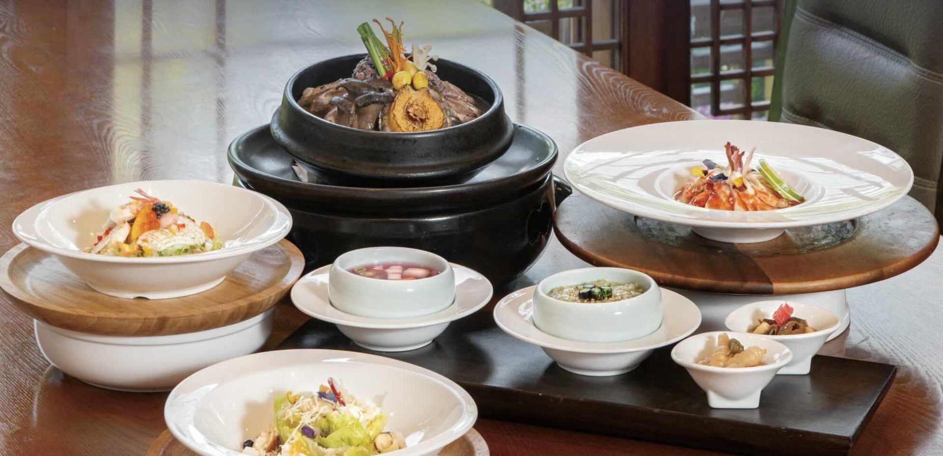 The course also includes seasonal porridge, mul-kimchi, romaine salad, grilled seafood with cold vegetables, a raw fish dish featuring Korean king prawn, three types of side dishes, dessert, and traditional tea.